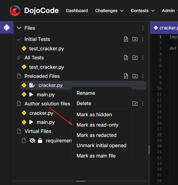 - Read-Only File: This file cannot be edited by users attempting to solve your code challenge.