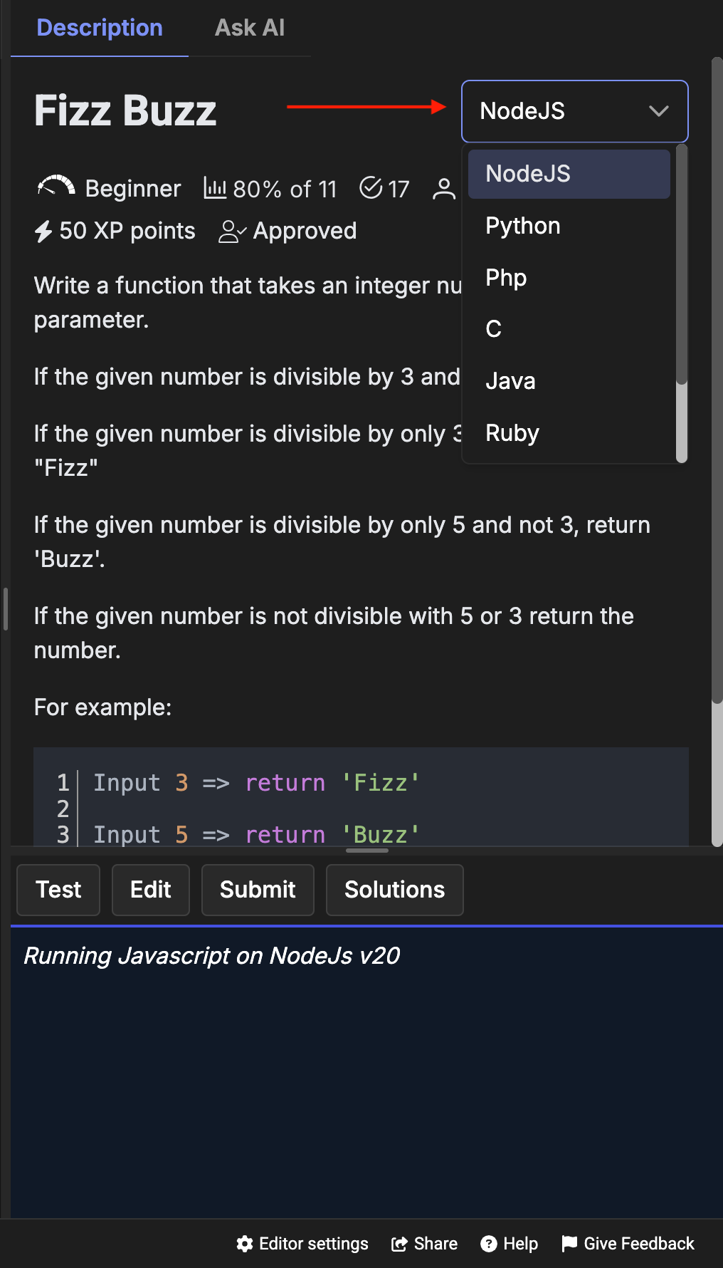 On the top-right corner of the Challenge info area, you will find a dropdown menu that allows you to choose the programming language in which you want to solve the challenge. (Fig. 2)